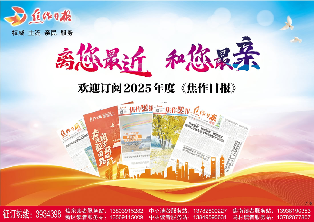 版權聲明 | 焦作網簡介 | 焦作日報社簡介 | 廣告服務 | 網上訂報 | 聯系我們 版權所有:河南省焦作日報社 地址:焦作市人民路1159號 報業·國貿大廈 郵編:454002 豫ICP備14012713號-1 互聯網新聞信息服務許可證:41120180013