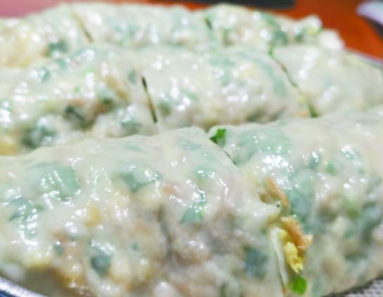 剛出鍋的菜莽晶瑩透亮,皮薄筋道,從中間切開,熱氣混著韭菜、雞蛋的香味就沖了出來,蘸著調配好的蒜汁,咬一口滿滿的都是菜,令人齒頰留香。