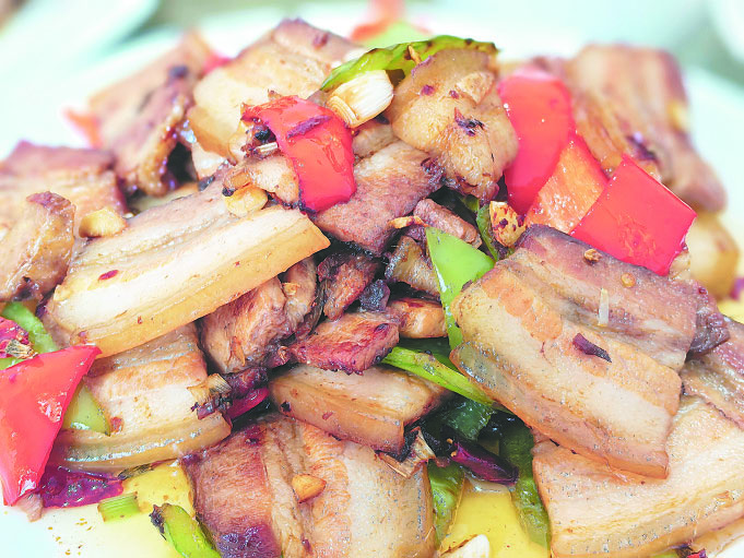 指著桌上的燒鹵制五花肉,靳海軍說:“這道菜做的時(shí)候在鍋中放少許油,將鹵好的五花肉放入鍋中稍煎一下。因?yàn)槲寤ㄈ獗旧砭陀杏,煎之前要少放油。放油是為了防止肉粘鍋,煎五花肉也能煉出來很多油,再佐以洋蔥、青紅椒,鮮香而不油膩。”