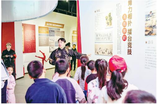 太極館總建筑面積約3萬平方米,可容納觀眾8000人,其中固定座位6000個(gè),活動(dòng)座位2000個(gè)。場館的設(shè)計(jì)從空間高度、光照度、溫度、通風(fēng)、地面、音響等均符合各類大型活動(dòng)的要求。整個(gè)體育館分為南北兩個(gè)區(qū)域,南半部分有比賽場地和熱身場地,北半部分有太極拳非物質(zhì)文化遺產(chǎn)展示館、體育主題展示館、道德模范展廳。當(dāng)天,小記者來到的是北半部分。本次活動(dòng)分為文化探秘和體驗(yàn)互動(dòng)兩個(gè)環(huán)節(jié)。在體育主題展示館內(nèi),小記者們通過珍貴的歷史圖片和實(shí)物展品,了解了中國體育的發(fā)展歷程;在太極拳文化展示館,解說員生動(dòng)講述了太極拳的起源與傳承,孩子們認(rèn)真記錄,不時(shí)發(fā)出驚嘆。