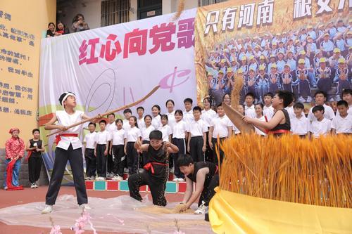 5月30日上午,解放區團結街小學全體師生歡聚在美麗的校園,共同迎接快樂的六一兒童節。圖為學生表演節目《在希望的田野上》。