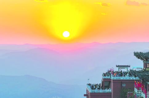 茱萸峰是觀賞日落的最佳景點,乘坐茱萸峰索道直達云臺之巔,極目遠眺,晚風輕拂,落日熔金般的壯麗景象盡收眼底。每當日落時分,游客紛紛匯聚于此,等待與夕陽邂逅,拍照打卡,記錄浪漫時刻。絢爛的天空如同一位技藝高超的畫家,以微風為筆,天空為卷,白云和晚霞做顏料,繪制出一幅幅浪漫至極的畫面,“王維詩里的云臺山”在此刻也具象化了。