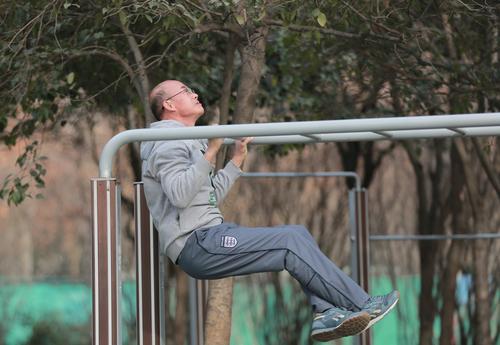 市龍?jiān)春珗@健身場(chǎng)地,市民進(jìn)行引體向上鍛煉。