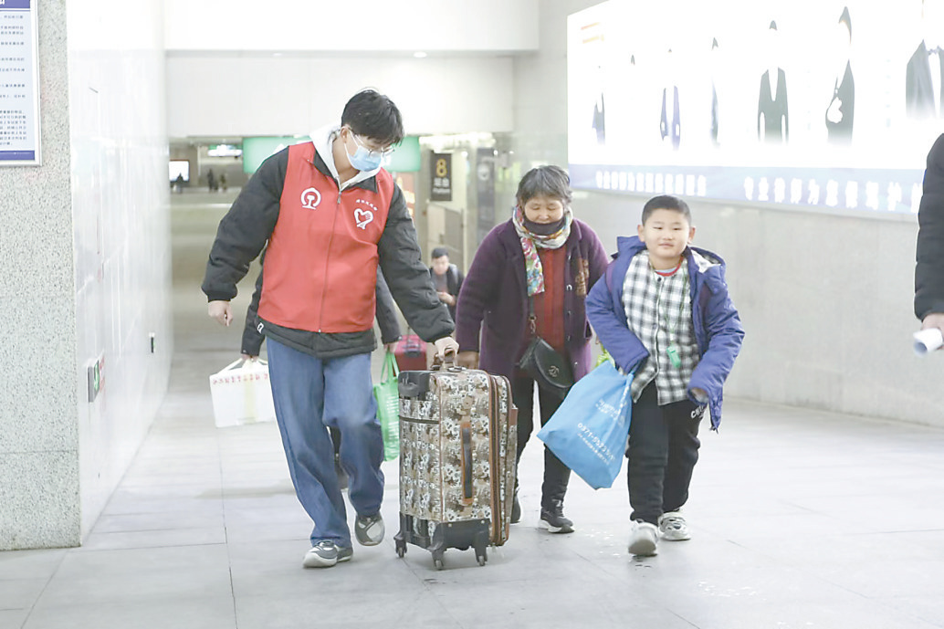 春運期間,青年志愿者在火車站幫助老幼搬運行李。