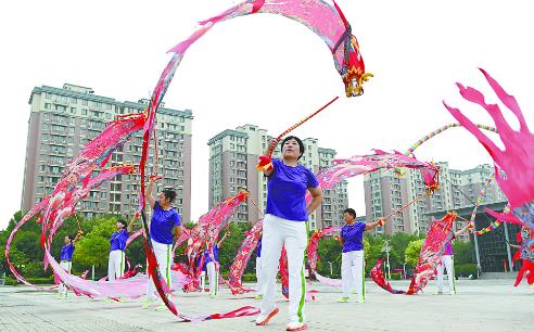 8月8日早晨,舞龍愛好者在沁陽市朱載堉音樂廣場舞動“彩帶龍”健身。8月8日是全民健身日,在沁陽市的廣場、公園,人們采用各種方式進行運動、健身。