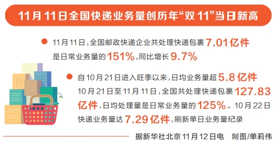 今年快遞業(yè)務(wù)旺季時(shí)間久、戰(zhàn)線長。自10月21日進(jìn)入旺季以來,截至11月11日24時(shí),全省郵政快遞業(yè)累計(jì)攬收快遞包裹6.35億件,日均業(yè)務(wù)量達(dá)2885萬件。其中,10月22日攬收快遞包裹3391萬件,刷新單日業(yè)務(wù)量紀(jì)錄。