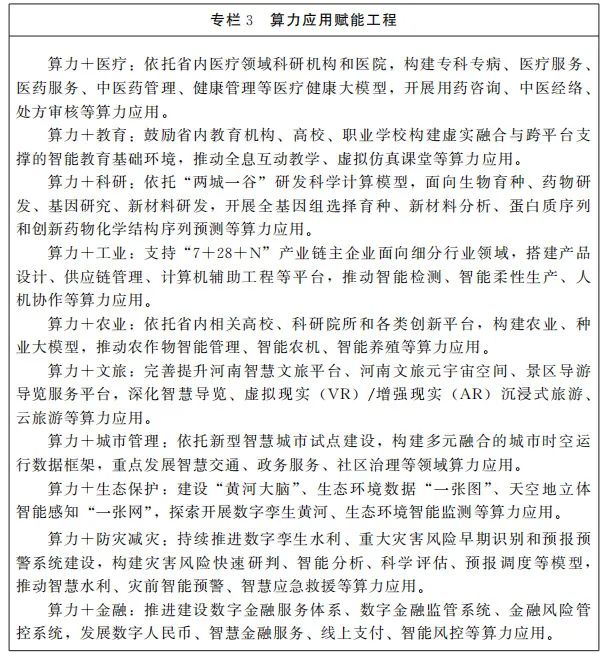 4.強化算力賦能。開展算力賦能專項行動,聚焦“7+28+N”產業鏈群培育,鼓勵企業開放應用場景,推動算力與各行業深度融合,加速數字化轉型升級。面向教育、文旅、政務、科研、金融等場景需求,積極推廣算力應用解決方案,打造一批可復制、可推廣的典型應用案例。圍繞醫療、農業、交通運輸、物流等優勢行業,推動垂域行業大模型建設,打造“算力、算法、數據”的生態閉環。引進一批高水平算力運營服務企業,提升算力集群一站式服務能力。推動開發區加快開展算力調度和應用,提升開發區數字化、智能化運營能力,帶動區內企業數字化轉型。