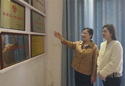 山陽區(qū)藝新街道冬香好媽媽工作站黨支部書記張冬香為記者介紹該站所獲得的榮譽(yù)。