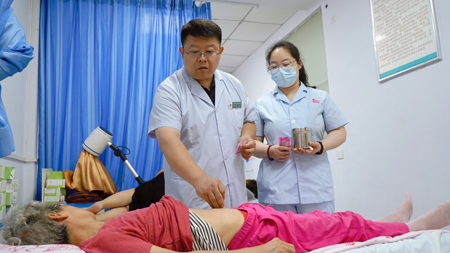 焦作市民間名中醫、解放區新華西社區衛生服務中心中醫科主任常虹為患者做中醫針灸治療。