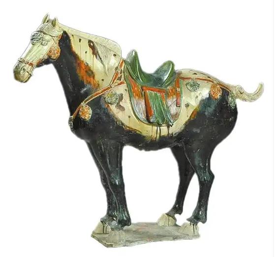 唐三彩是盛行于唐代的一種低溫彩釉陶器。它不止3種顏色,所謂“三彩”是多彩之義。除常見(jiàn)的黃、綠、白,還包括褐、藍(lán)、紫等釉色。由于當(dāng)時(shí)的釉料中并未包含黑色,匠人需反復(fù)施釉方能偶然在窯火中淬煉出深邃的黑色。這尊三彩黑釉馬的珍貴,正在于這“偶然”中的“必然”。