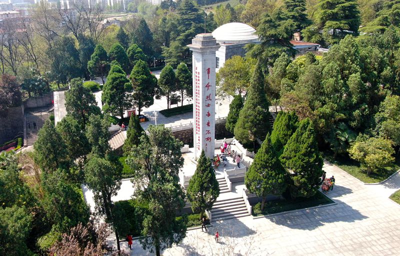 人們在鄂豫皖蘇區首府烈士陵園革命烈士紀念碑前祭奠。河南省新縣地處大別山腹地,是鄂豫皖蘇區首府所在地,這里先后誕生了紅四方面軍、紅二十五軍、紅二十八軍等多支紅軍主力(2021年4月4日攝 無人機照片)。新華社記者 郝源 攝