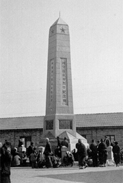 2、解放后的焦作老廣場(現在的貿易大廈)。紀念碑后來遷到了東方紅廣場(摘自《焦作老照片》)。