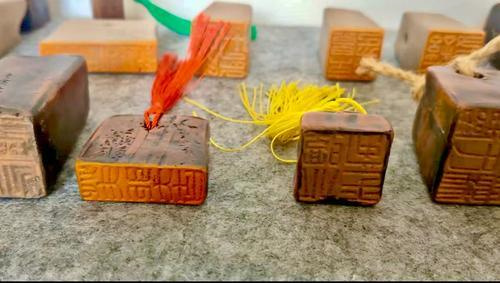 武陟河段的黃河泥富含膠質,經過塑型和燒灼后,能夠幻化為青、黃、紫等多種顏色的器皿、樂器和印刻等藝術品。這些黃河泥制品,在一代代非物質文化遺產傳承人的手中,逐漸融合了音樂、美術、雕刻、書法等多種技藝,成為兼具欣賞、演奏和實用功能的精美藝術品,宛如一股清流,在傳承黃河文化的道路上潺潺流淌。黃河泥印就是其中的代表。