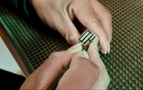 圖④⑤ 郭新林在刻黃河泥印。