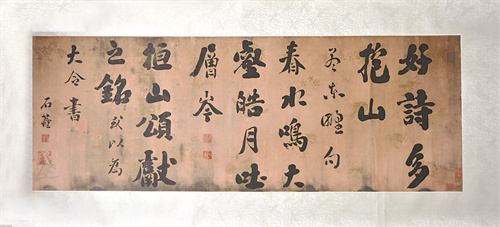 武陟縣博物館珍藏的劉墉書法作品橫長115.7厘米、縱長42厘米,紙底,綾裝裱,行楷書,多枚朱、白文名號鈐印,釋文:“好詩多抱山。孟東野句。春水鳴大壑,皓月吐層岑。桓山頌獻之銘;蛞詾榇罅顣。劉墉。”