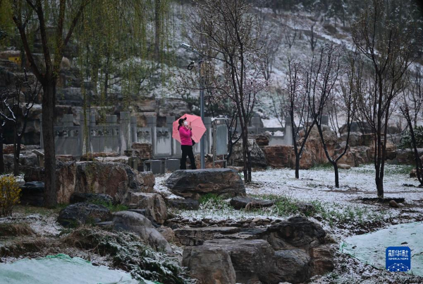 4月22日,市民在青海省西寧市城西區一處森林公園里在行走。當日,青海省西寧市迎來降雪天氣。新華社記者 張龍 攝