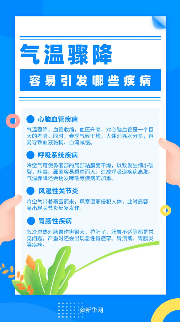 春季氣溫忽高忽低,乍暖還寒,尤其氣溫大幅度驟降,容易引發以下疾病,要格外注意身體健康↓↓↓