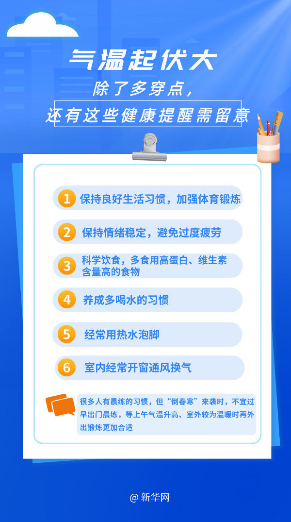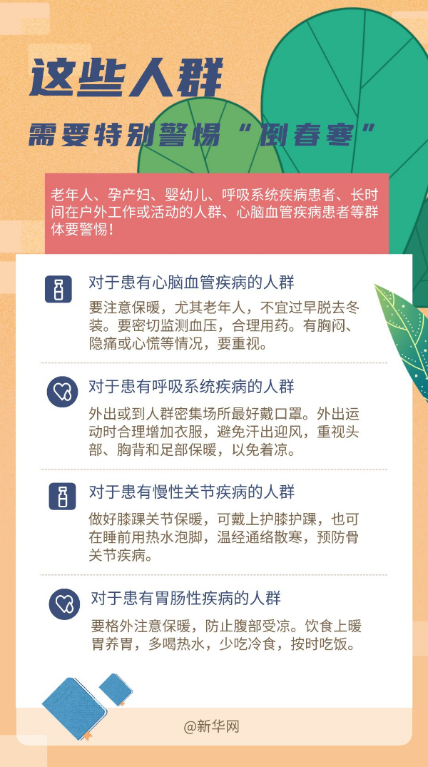氣溫大幅度下降考驗著身體狀況,尤其對于老年人、孕產婦、嬰幼兒、呼吸系統疾病患者、長時間在戶外工作或活動的人群、心腦血管疾病患者等群體,更要警惕“倒春寒”帶來的健康影響。