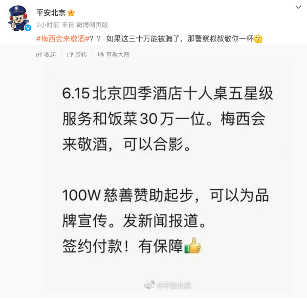 近日,北京市公安局官微發(fā)文,辟謠一則關(guān)于“梅西會來敬酒、可以合影,30萬一位”的假消息。