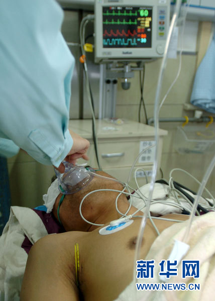 8月2日,在山東大學(xué)第二醫(yī)院,中暑農(nóng)民工王樹昌因體溫太高,溫度計已無法正常讀數(shù)。新華社記者 郭緒雷 攝
