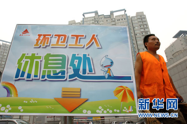 環(huán)衛(wèi)工閆寶華因中暑搶救無效去世后,濟南市發(fā)起“關(guān)愛環(huán)衛(wèi)工,共建休息處”行動,沿街企事業(yè)單位專辟場地供環(huán)衛(wèi)工人休息避暑。新華社記者 郭緒雷 攝