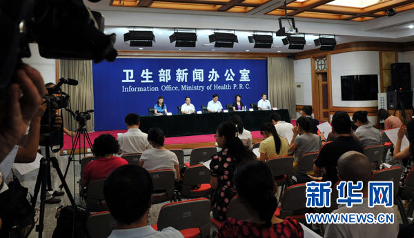 8月15日拍攝的新聞發布會現場。8月15日,衛生部舉辦新聞發布會通報圣元奶粉檢測結果,未檢出己烯雌酚和醋酸甲孕酮等禁用的外源性性激素,內源性雌激素和孕激素的檢出值符合國內外文獻報道的含量范圍。衛生部專家組評估認為,湖北三例嬰幼兒單純性乳房早發育與食用圣元優博嬰幼兒乳粉沒有關聯,目前市場上抽檢的圣元乳粉和其他嬰幼兒乳粉激素含量沒有異常。 新華社記者 何俊昌 攝