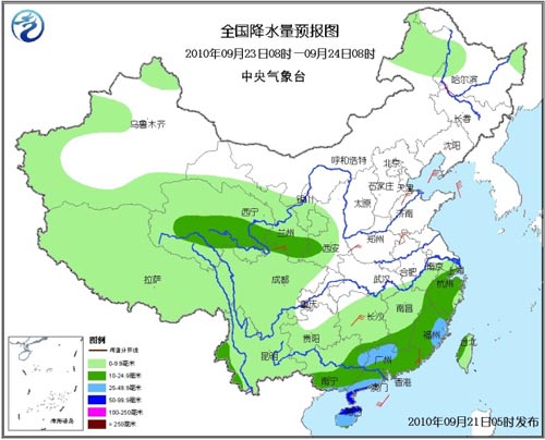 23日08時至24日08時,新疆西部、西藏、青海、西北地區中東部、內蒙古東北部、黑龍江西部和東北部、西南地區大部、江南、華南等地有小到中雨或陣雨,其中,福建東部、廣東西北部和南部、海南、廣西南部沿海等地有大雨,部分地區有暴雨。上述地區局部并伴有短時雷雨大風或冰雹等強對流天氣。黃淮、華南南部沿海等地有4~6級風。渤海、黃海北部海域有6~7級風。