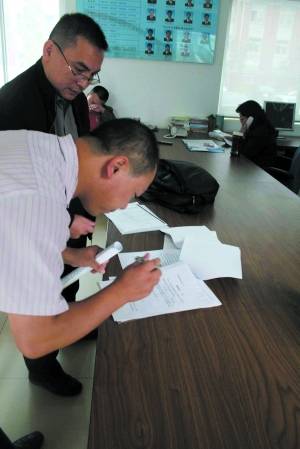 方玄昌在申請書上簽字。晨報記者 郝濤/攝