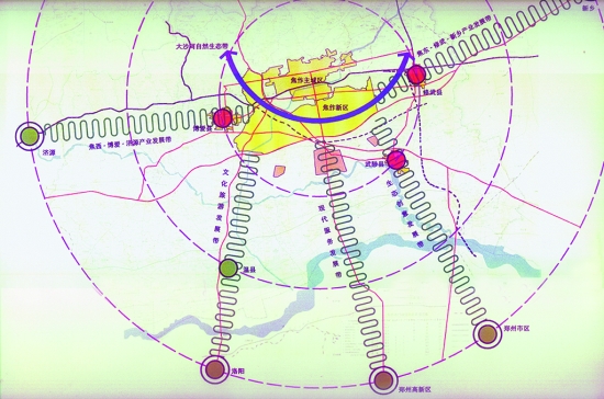 而新焦作張開的“手掌”,恰恰是五條城市發展帶:一是聯系博愛、濟源,依托現有的西部工業集聚區,向博愛延伸,形成“機械—汽配”產業集群,做大做強機械、汽配相關產業;二是聯系溫縣、洛陽,讓溫縣的太極文化及洛陽的古都文明與焦作的山水文化形成對接;三是聯系鄭州高新區、登封,將主城區、焦作新區與鄭州在空間上銜接,延續城市向南發展的脈絡,形成現代服務發展帶;四是聯系武陟縣區、鄭州市區,依托高新區科技研發優勢及武陟的食品、農副產品加工優勢,形成“食品—生物醫藥”產業集群,圍繞焦作的“四大懷藥”進行產業研發生產,提升焦作食品、生物醫藥的整體開發水平;五是聯系修武、新鄉,充分利用焦作新區的研發基礎,以及焦東組團現有的產業發展基礎和修武的工程裝備及機械制造的良好發展態勢,發展“電氣”產業集群。