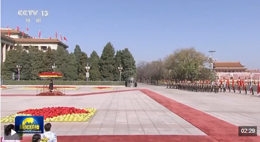 哇集拉隆功抵達(dá)時(shí),禮兵列隊(duì)致敬。習(xí)近平同哇集拉隆功登上檢閱臺,軍樂團(tuán)奏中國國歌和泰國頌圣歌,天安門廣場鳴放禮炮21響。哇集拉隆功在習(xí)近平陪同下檢閱中國人民解放軍儀仗隊(duì),并觀看分列式。