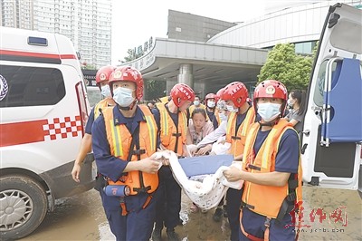 焦作市消防救援支隊抗洪搶險救災突擊隊隊員正在鄭大一附院轉移病人。