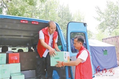 潘東北(左)正在給村民發(fā)放救災(zāi)物資。