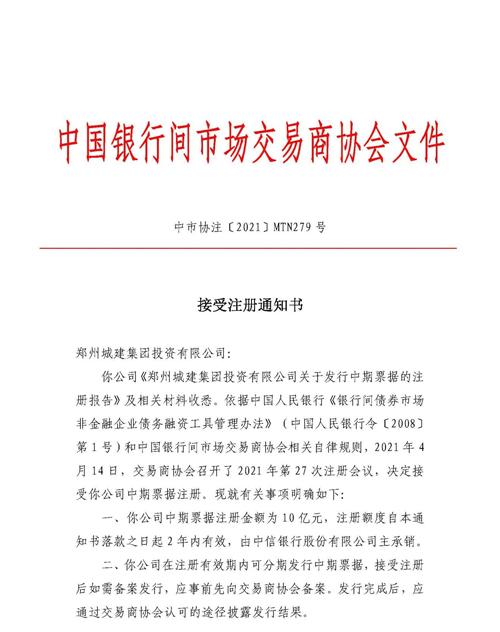 2021年4月21日,鄭州城建集團投資有限公司2021年度第一期中期票據在中國銀行間市場交易商協會完成注冊,注冊金額10億元,由中信銀行擔任主承銷商。