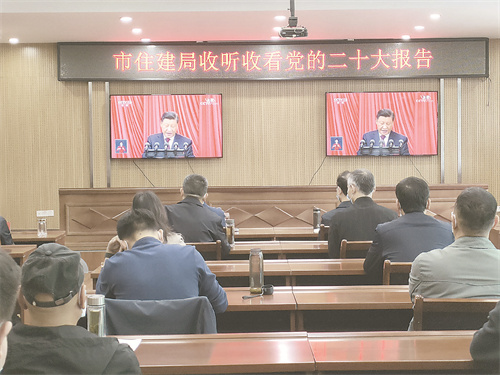 市住建局黨員干部在收聽收看黨的二十大開幕會。本報記者 張 璐 攝