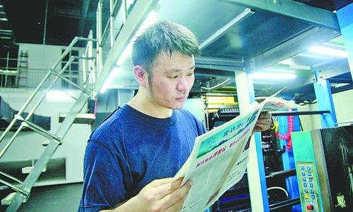 劉斌在查看剛剛印刷出來的報紙。記著 宋崇飛 攝
