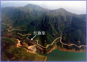 二十世紀六、七十年代,河南林縣(今林州市)為解決農業用水問題,在太行山的陡坡上修建了坡度很小、蜿蜒曲折的跨流城調水工程---紅旗渠(如上圖)。