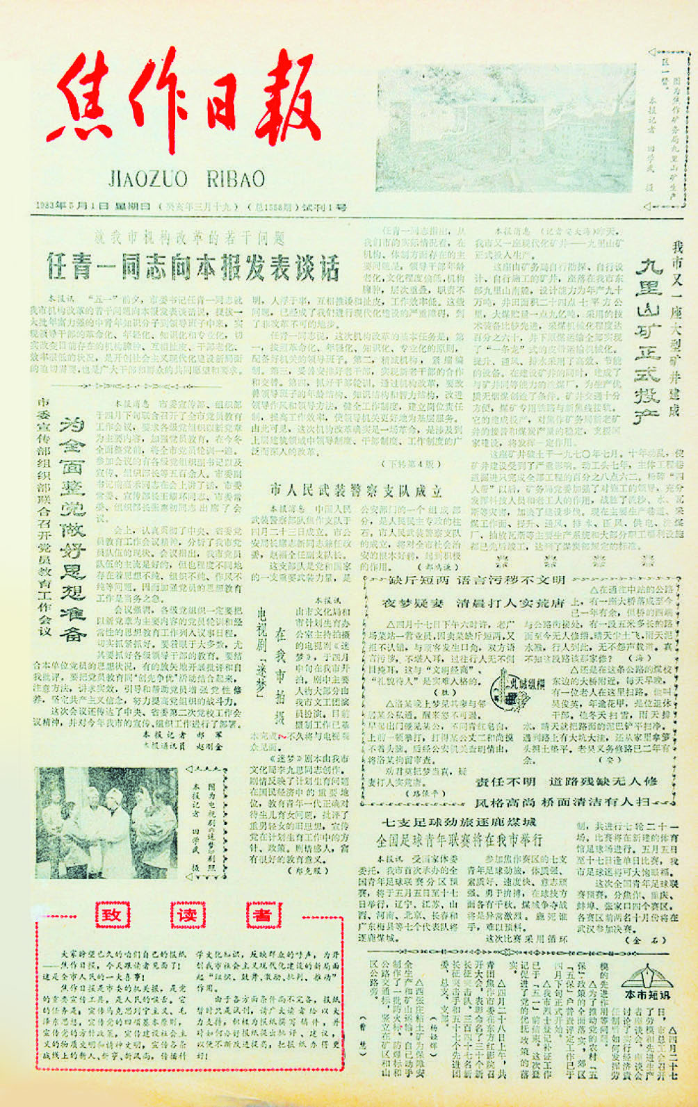 “《焦作日報》是市委機關報,是黨的重要宣傳工具,是人民的喉舌……由于各方面條件尚不完備,報紙暫時只是試刊,請廣大讀者給以大力支持,積極為報紙撰寫稿件,并對如何辦好報紙提出批評建議,以便不斷改進提高,把報紙辦得更好!”樸素的試刊詞,表達了《焦作日報》的辦報理念。