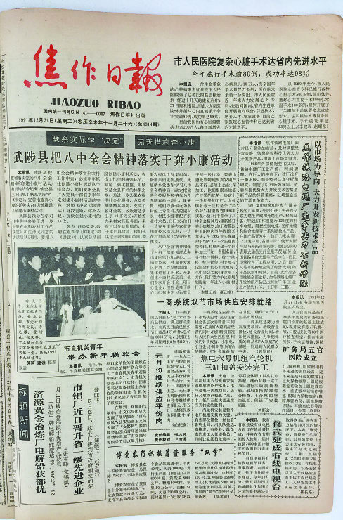 1991年12月31日《焦作日報》頭版最后一期四開小報。 (本報資料照片)