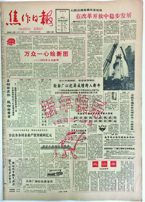 1992年1月1日《焦作日報》頭版第一期對開大報。 (本報資料照片)